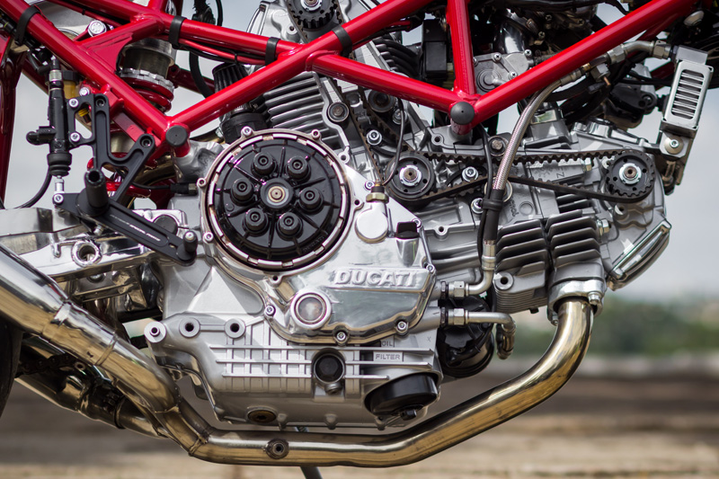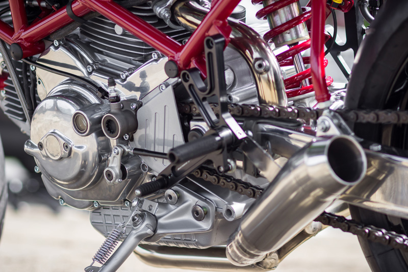 O responsável pela transformação foi Sebastián Rochón da SR Corse (fizemos uma matéria com ele que você pode ler aqui) que, com muito capricho, executou um projeto de sonhos inspirado nas Ducati 125 TS dos anos 60 a partir de um Monster 900 1999.