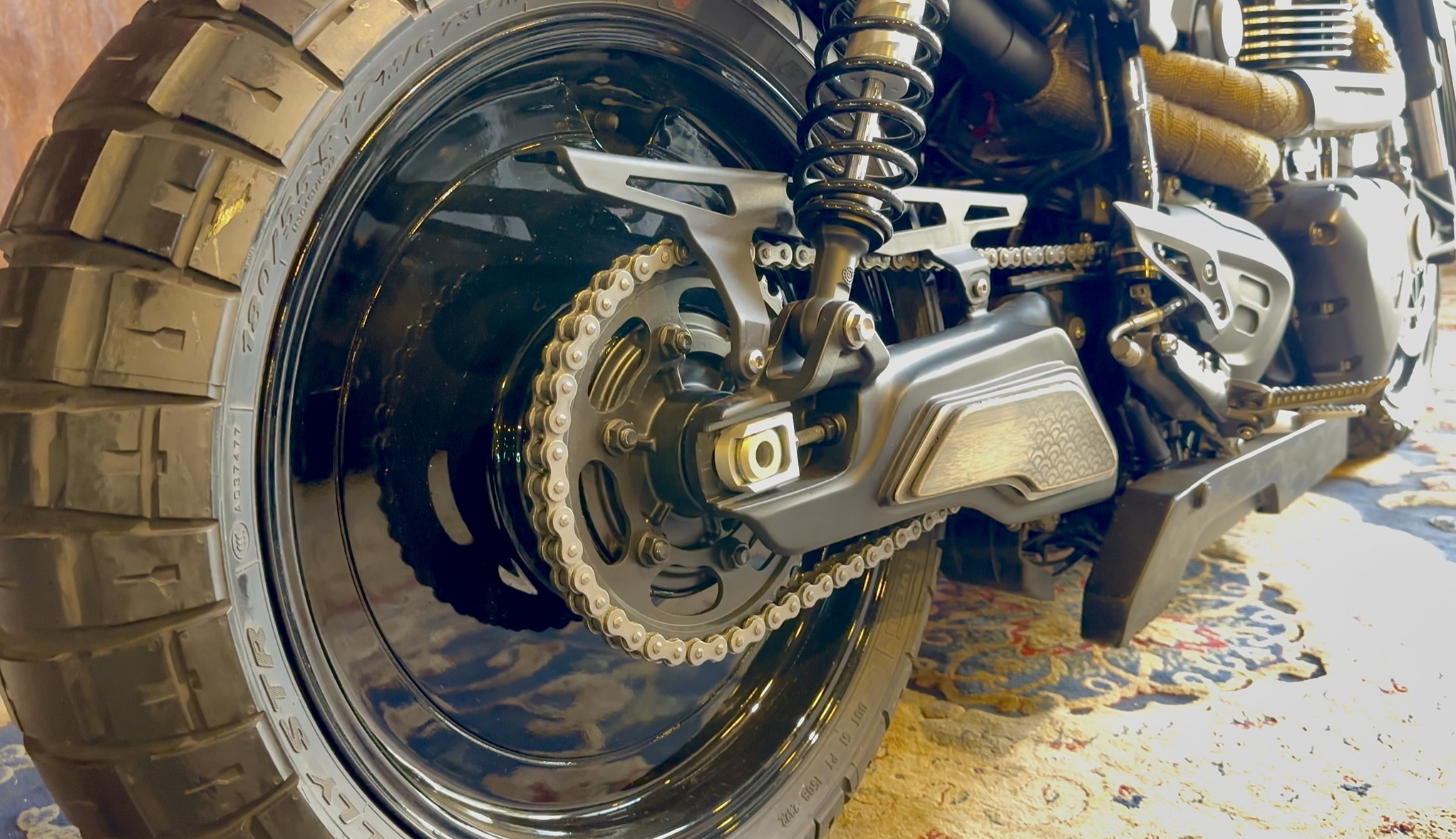 Nada disso veio pronto: 90% do trabalho foi feito à mão. A ergonomia foi redesenhada para traduzir velocidade em postura: garfos dianteiros encurtados, traseira rebaixada. Mesmo em marcha lenta, a Gaijin parece prestes a dilacerar o asfalto.